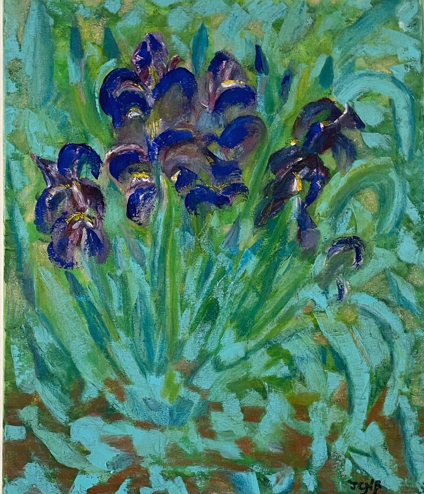Inspiré bien évidemment du style de Vincent Van Gogh , j ai peint cette toile à partir d’iris en plate-bande de la terrasse très ensoleillée de mes parents à Plan de Cuques à l’aube de ce nouveau siècle.